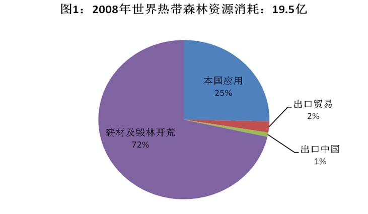 表1中所列国家为《毁灭的欲望—中国的非法木材贸易》中列举的案例国家或地区,其资源年增长量按蓄积量的1.4%计算,再按60%原木出材率计算。可以看出,中国进口木材量占案例国家木材资源年增长量比重极小,中国木材进口与这些国家资源破坏没有必然联系。 二、中国进口木材与世界热带森林非法采伐没有正相关性。报告中所列举的案例国家除俄罗斯外均为热带国家。从20世纪九十年代起,一些热带国家存在的非法采伐以及毁林问题就引起了国际社会的广泛关注。近些年来,一些国际非政府组织发表了类似《毁灭的欲望-中国的非法木材贸易》的报道,将中国推到了国际舆论的风口浪尖。然而,对于中国木材进口导致热带国家非法采伐及毁林这一论调,以下数据给出了最有力的驳斥。 根据联合国粮农组合《世界森林状况2011》中的数据,2008年世界热带森林资源消耗19.5亿立方米,其中出口到中国的贸易量为1020万立方米,消耗热带森林资源约1700万立方米,占热带森林资源总消耗量的1%。热带森林资源消耗主要还是归因于薪材的使用以及毁林开荒(见图1)。