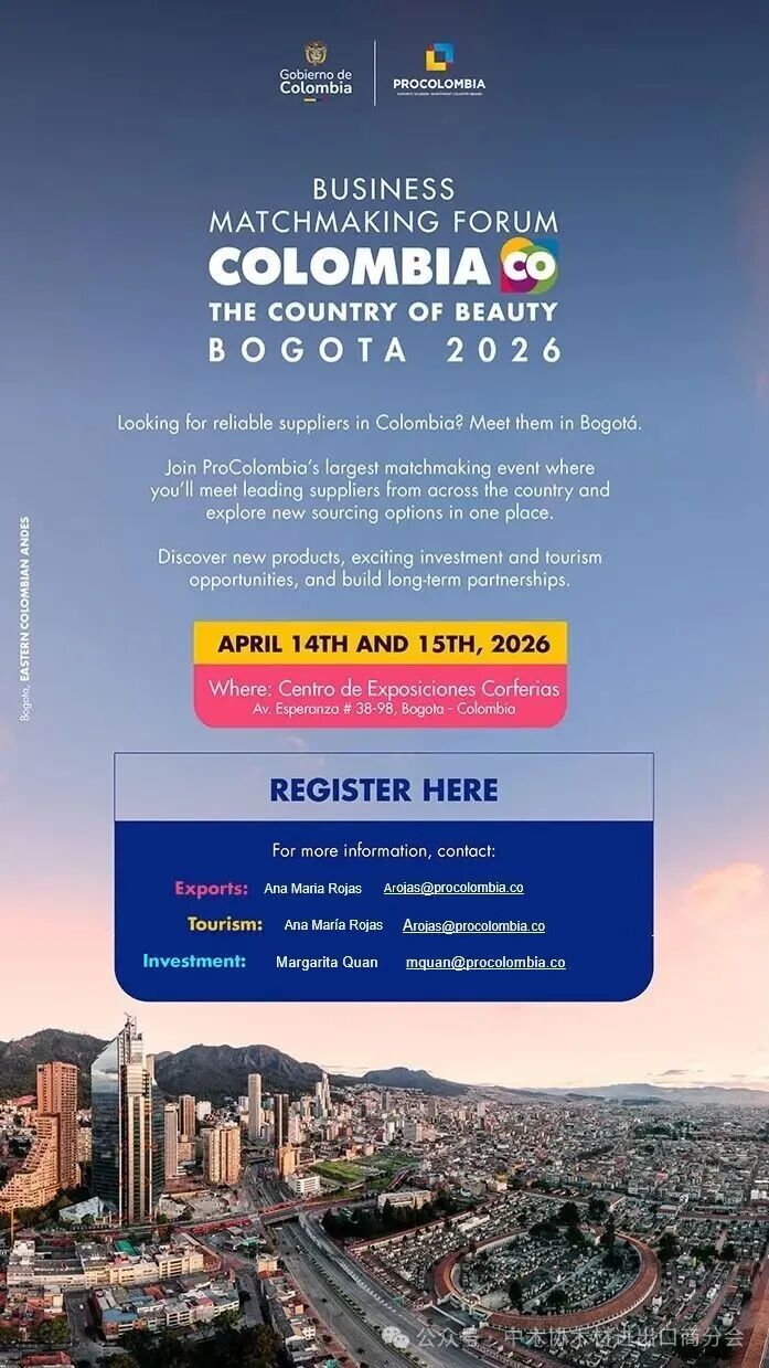 “哥伦比亚,至美之地”商务对接论坛将于2026年4月14日至15日在哥伦比亚首都波哥大举办。此次活动是由哥伦比亚贸易、工业和旅游部及哥伦比亚贸易投资旅游局(ProColombia)主办的最重要商业活动之一。我们将哥伦比亚出口商与国际买家连接起来,双方在共同的商业兴趣下进行对接,旨在促进创造双方之间的商业机会。
